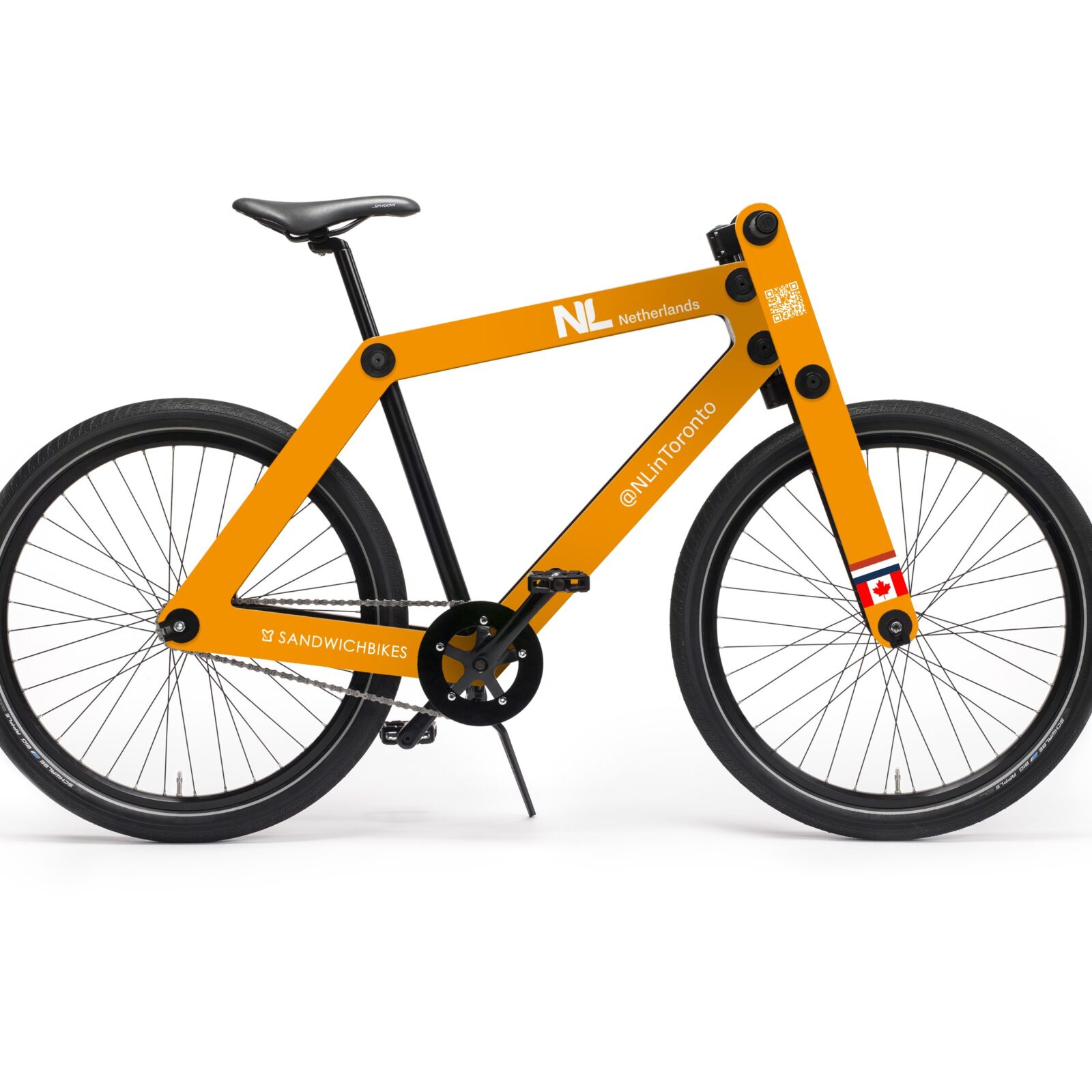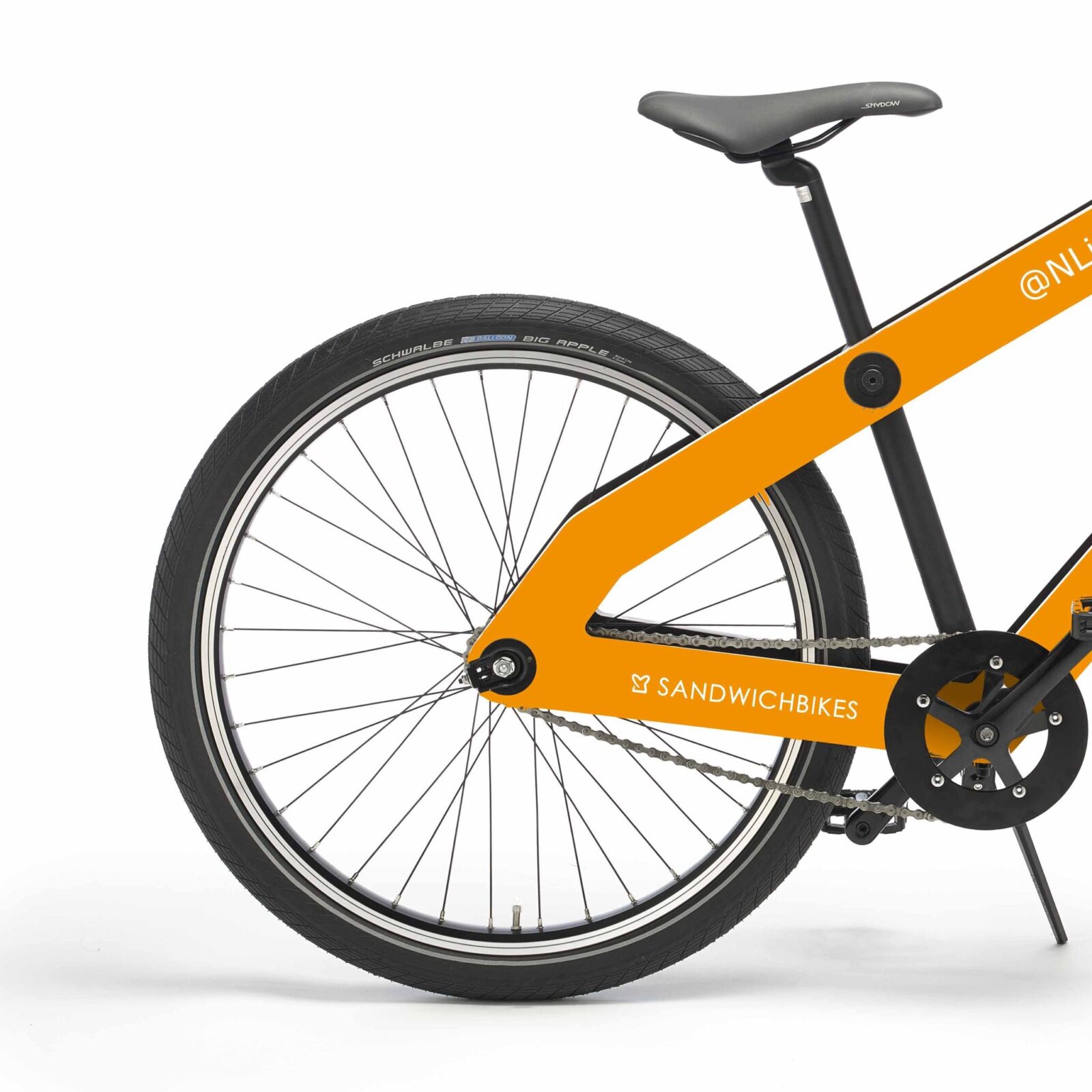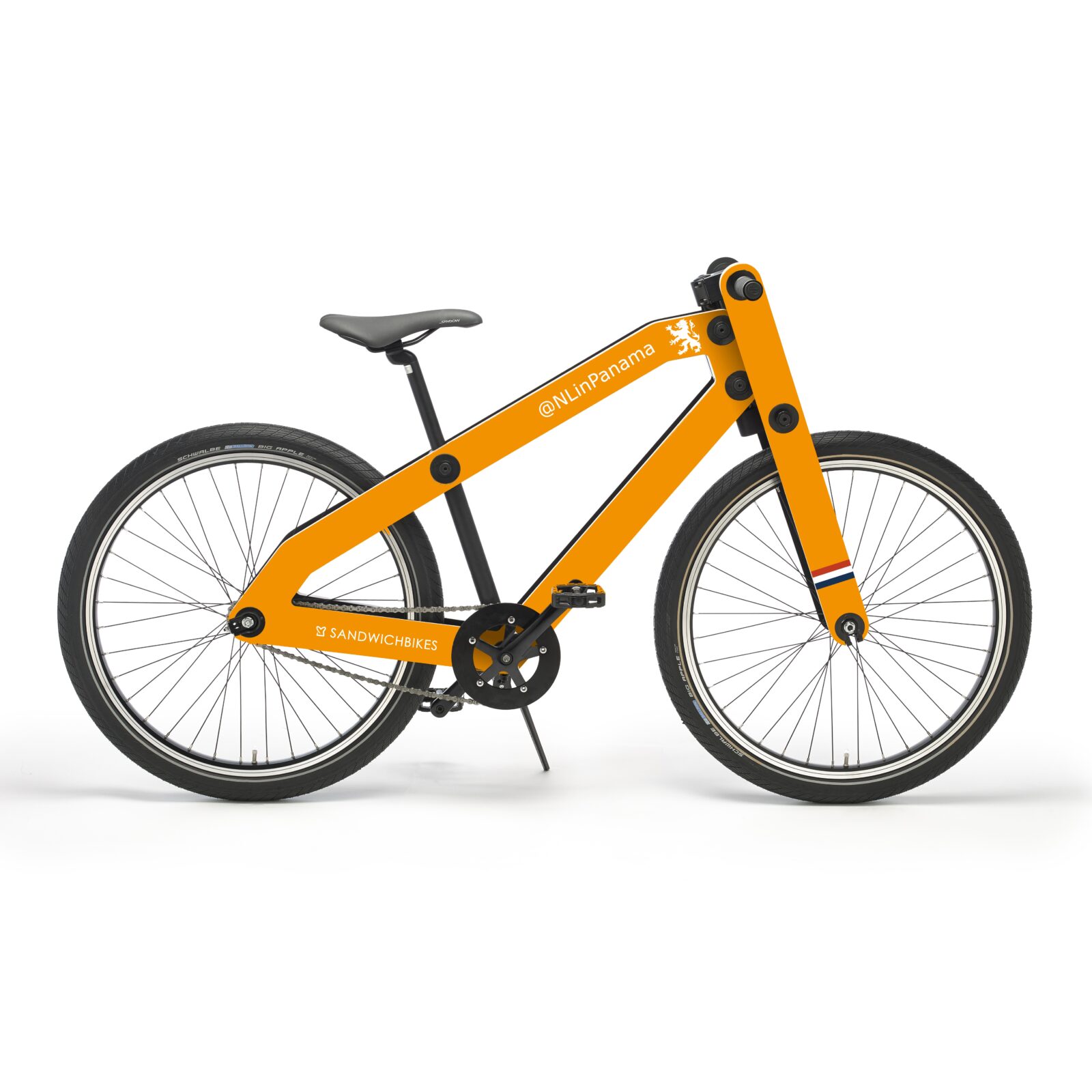 Orange is the colour of this Sandwichbike. The large surface of the frame offers many customize possibilities. Every idea or design source can be transferred to a Sandwichbikes personalized design.